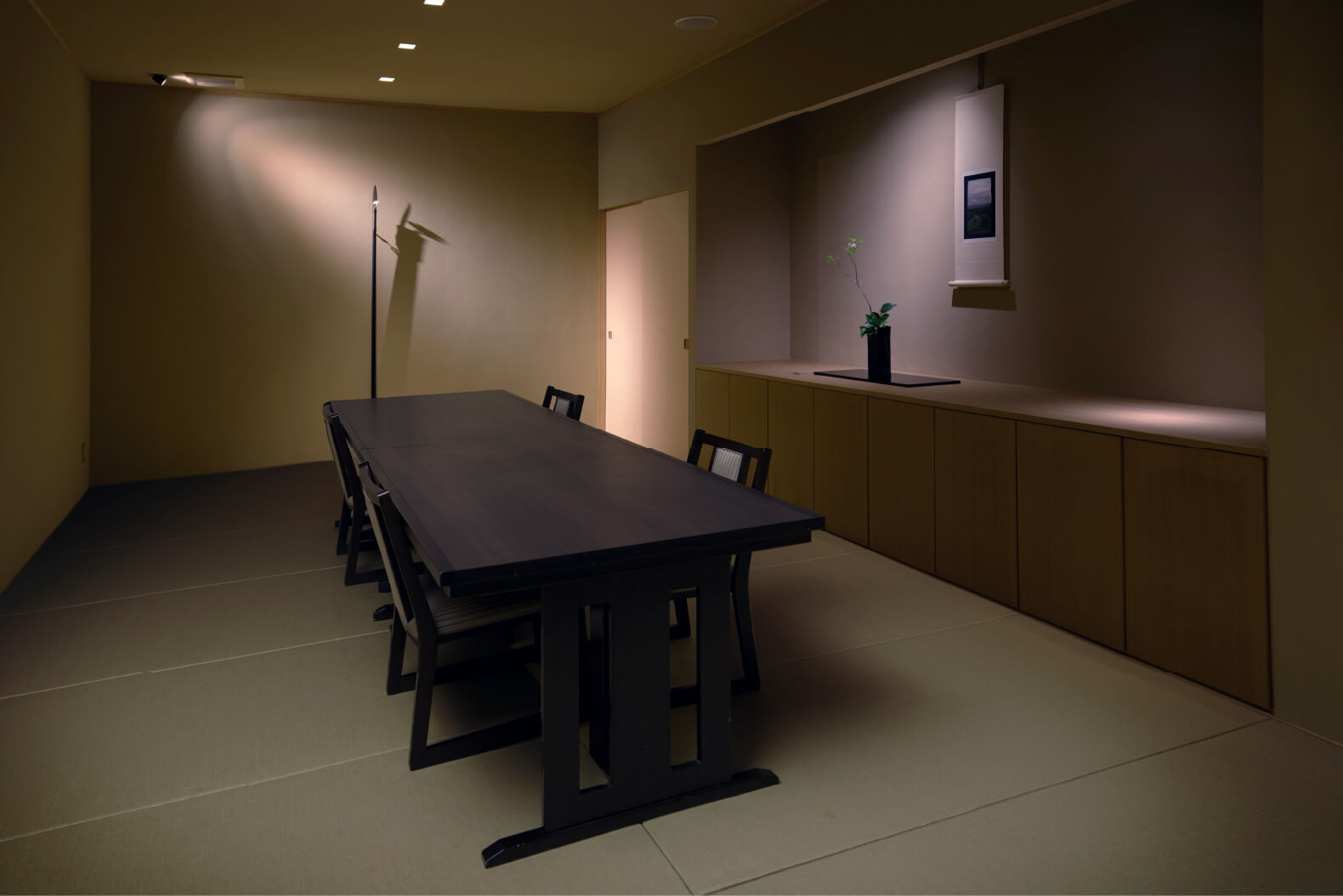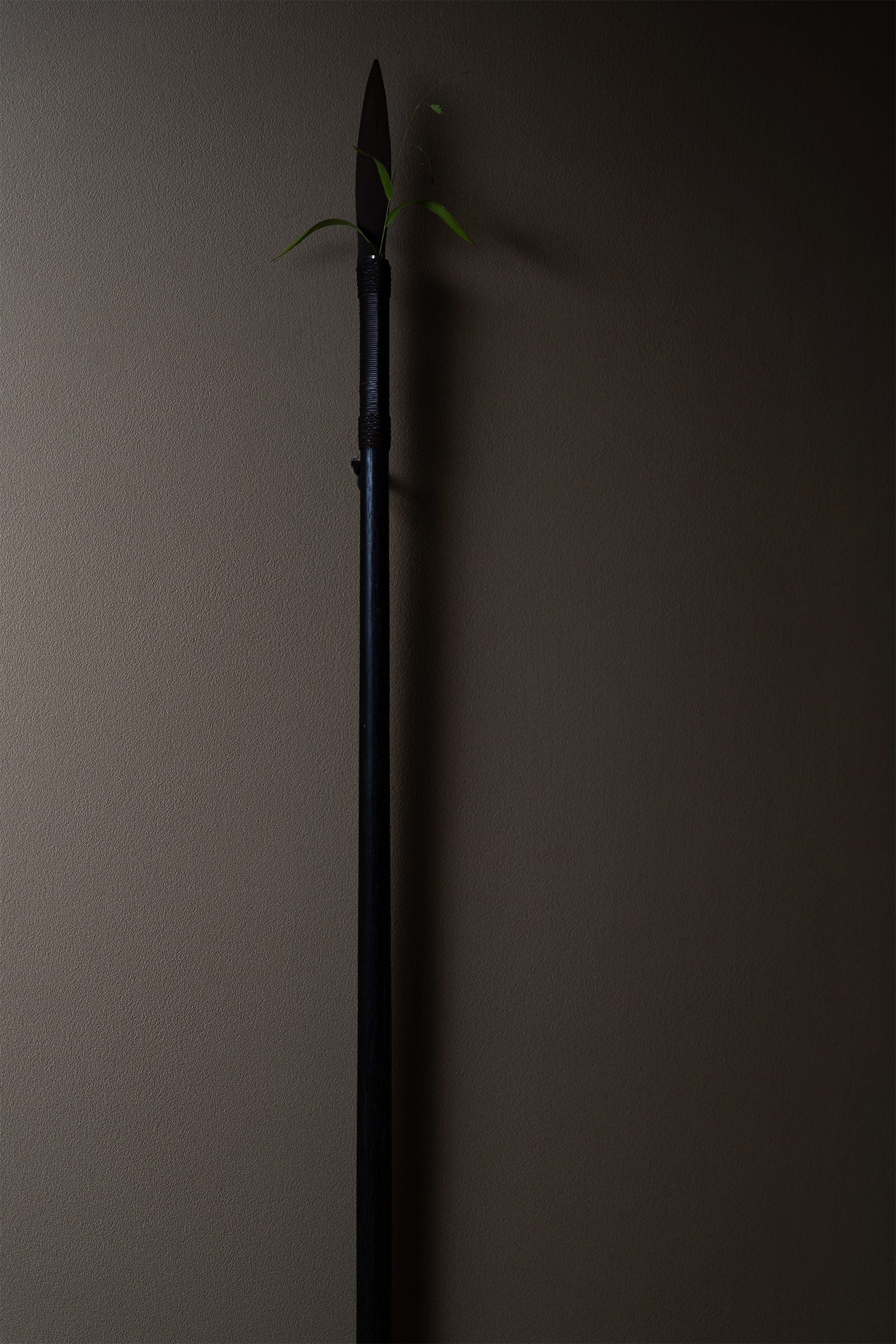一輪挿しとしては異例の大きさを誇るこの吹き矢は、ただの器を超えてコンテンポラリーアートの真髄を体現しています。さらに、館主は照明の演出にもこだわり、長いシルエットを強調するため、斜め上から光をあて影までも作品の一部として際立たせています。