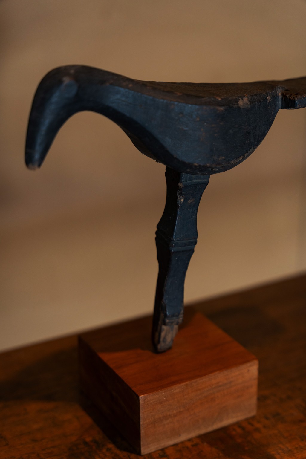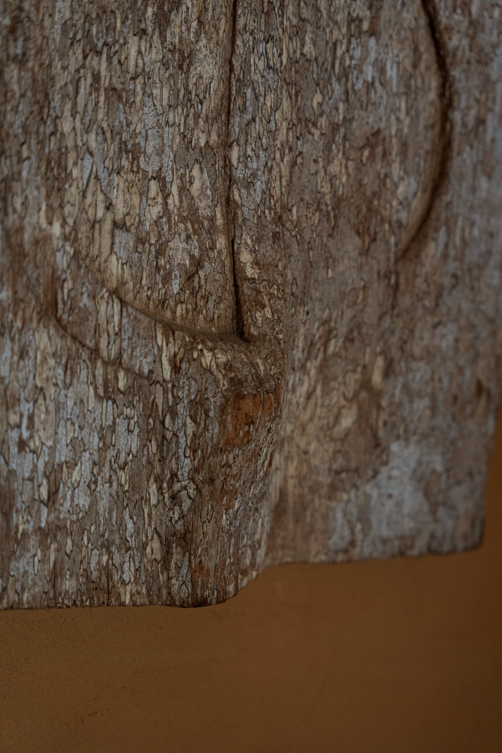 トラジャ地方の扉は、かつて家族の大切な宝物を守っていたという小さな木扉で、水牛のレリーフが彫られています。水牛はこの土地で守り神とされ、日々の暮らしと精神性の象徴でもありました。長い年月の風雪に耐えた木肌は、空間に時間の深みをもたらし、扉の向こう側にあった生活の記憶に想像を誘います。