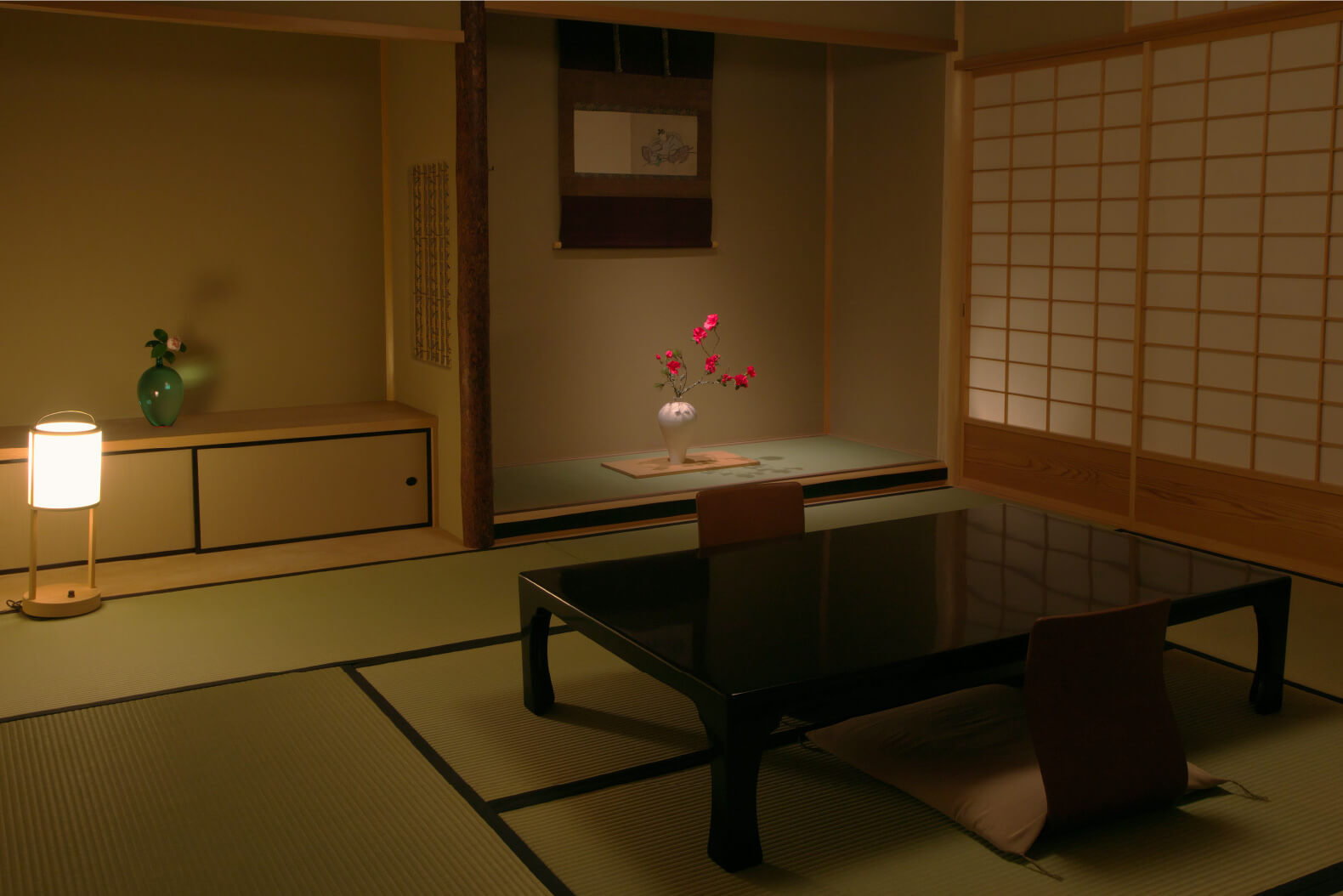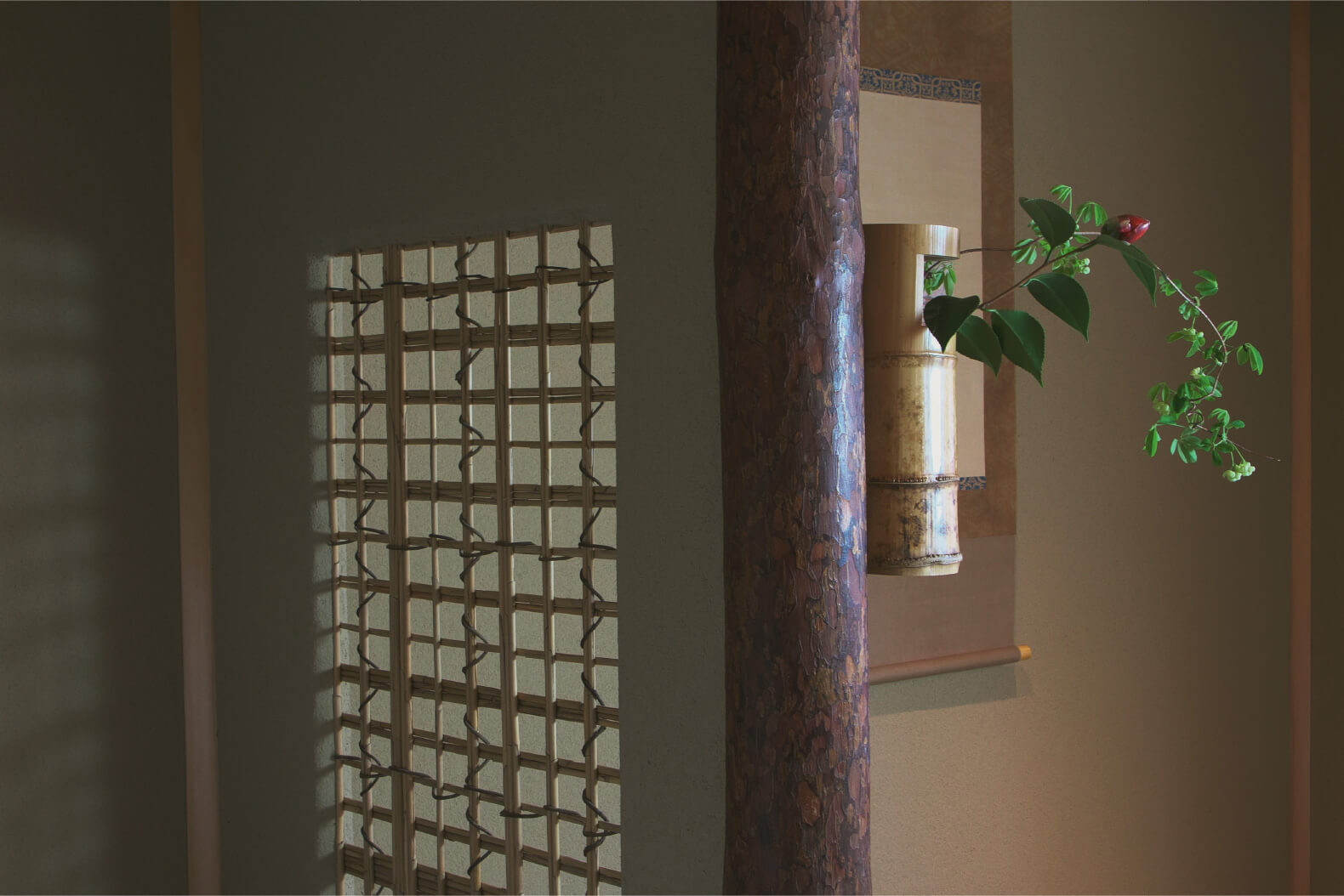和室设有带树皮的赤松柱与聚乐壁,充满韵味。栗木刨面处理的宽缘可静享风景,是放松的理想之地。精心打造的床之间适合悬挂画轴与插花,尽显格调与品位。