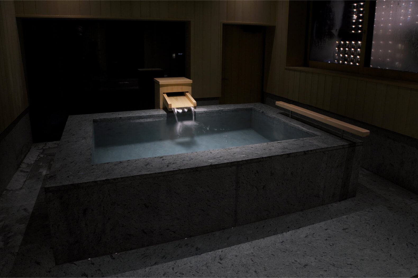 十和田石浴缸注入银泉,温柔包裹身心。墙面使用扁柏材,木香萦绕,营造放松氛围。温泉的温暖与自然材质的温润,带来极致治愈时光。